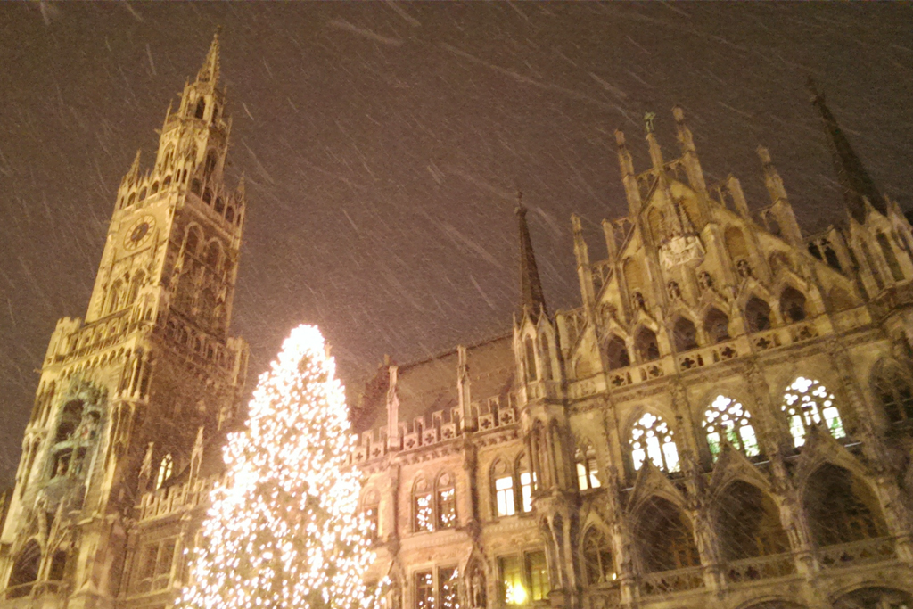 Snowy Marienplatz in December. Blurry photo due to Mulled Wine.
