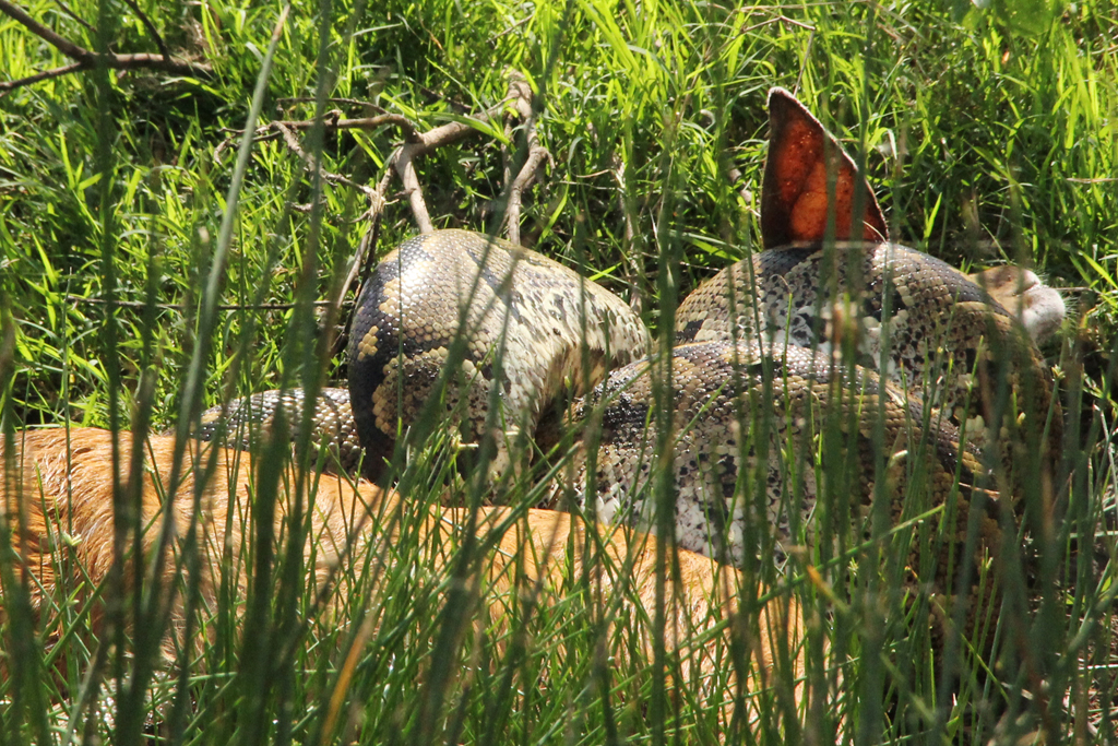 A close up of the python attack. Our guides were even more fascinated than us as this event is very rarely witnessed by humans.
