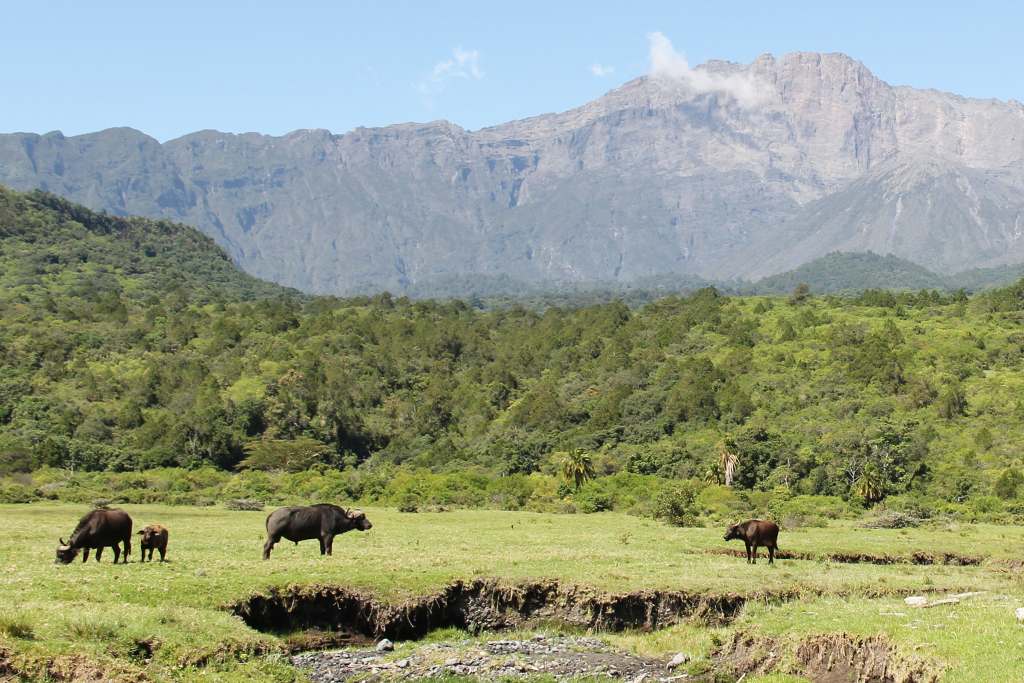 Mount Meru is the centerpiece of Arusha National Park. Its fertile slopes rise above the surrounding savanna and support a forest that hosts diverse wildlife.